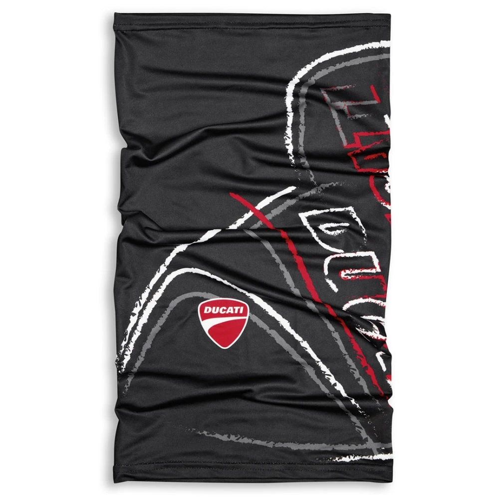 Black neck warmer with stylish print in white and Ducati red. Featuring iconic Ducati shield.