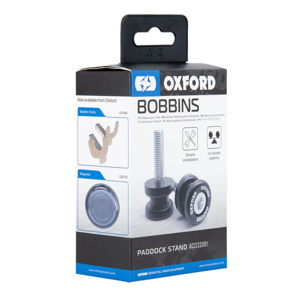 The Oxford Bobbins M12 (1.25 Thread) Black provide a secure frame connection to facilitate speedy installation of a rear paddock stand. Attachment of forks to the stand is necessary before use.