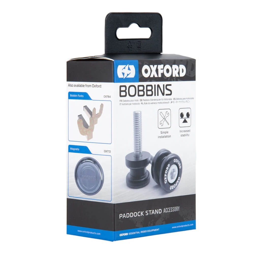 The Oxford Bobbins M6 (1.0 Thread) Black are designed to expedite the installation of a rear paddock stand by providing a secure frame connection. Prior to use, forks must be fitted to the rear paddock stand.