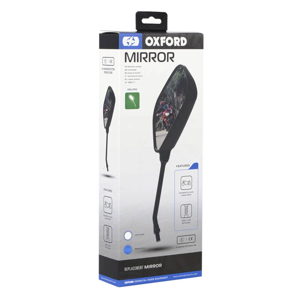 The Oxford Mirror Oblong Right is designed to work with most naked motorbikes, making it an excellent option as a replacement mirror.