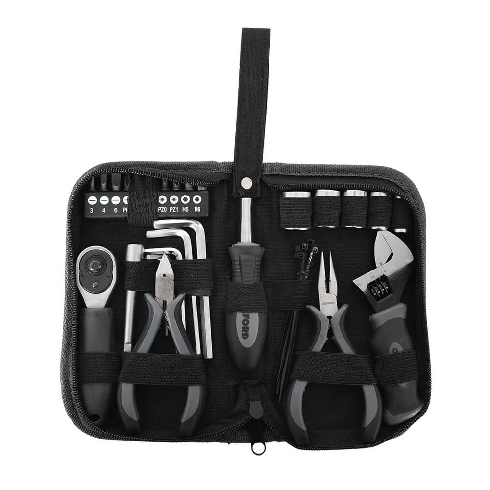 The Oxford Tool Kit Pro is a comprehensive 27-piece premium motorcycle tool set. Each tool features a soft gel handle for comfortable use and elasticated straps for secure storage in the included compact case, designed to fit conveniently under the rear seat. Constructed from durable chrome vanadium steel, the sockets, extension bar, and hex keys offer durability.