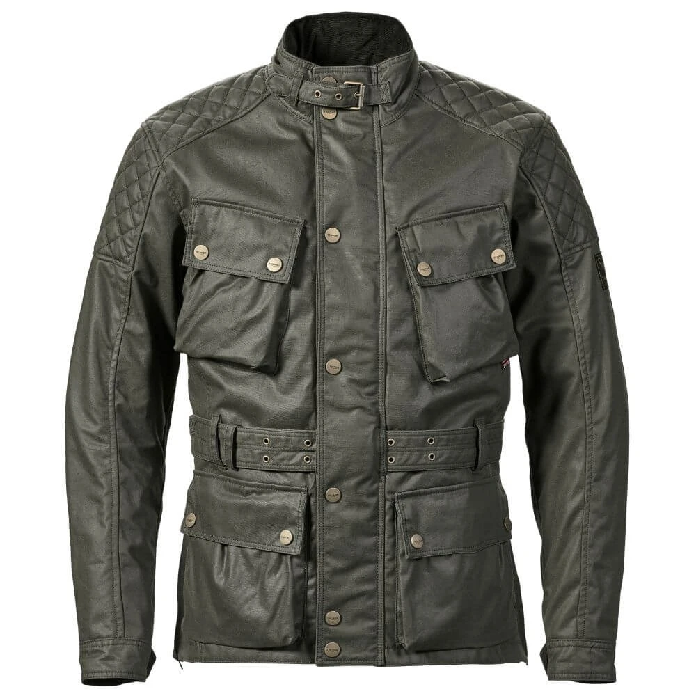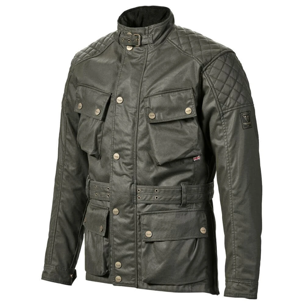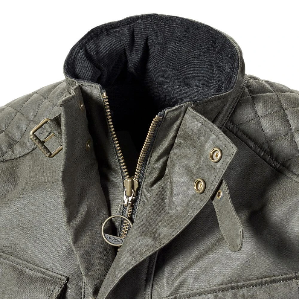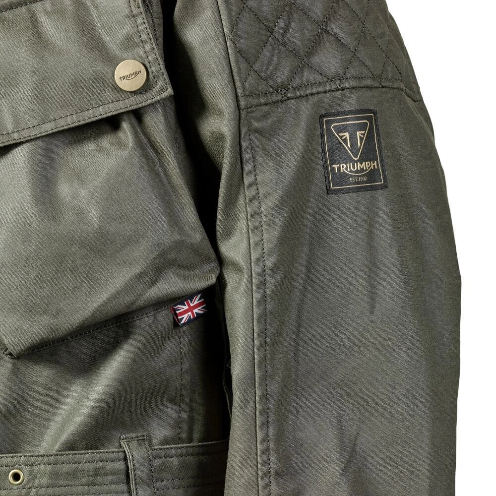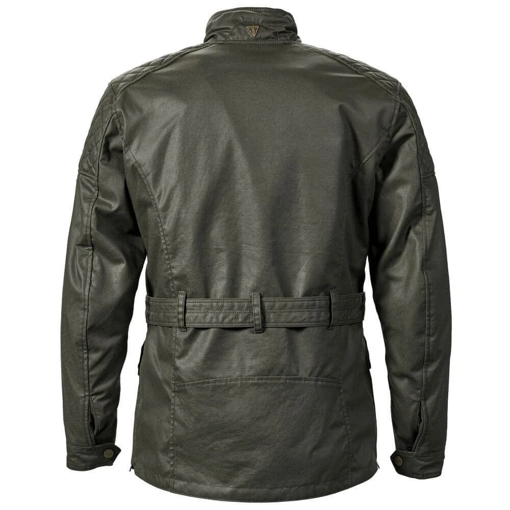 The Triumph Beck 100% waxed cotton Khaki jacket has removable CE certified protectors, six pockets, removable quilted vest liner and action back design for enhanced rider comfort, plus abrasion-resistant internal engineering.