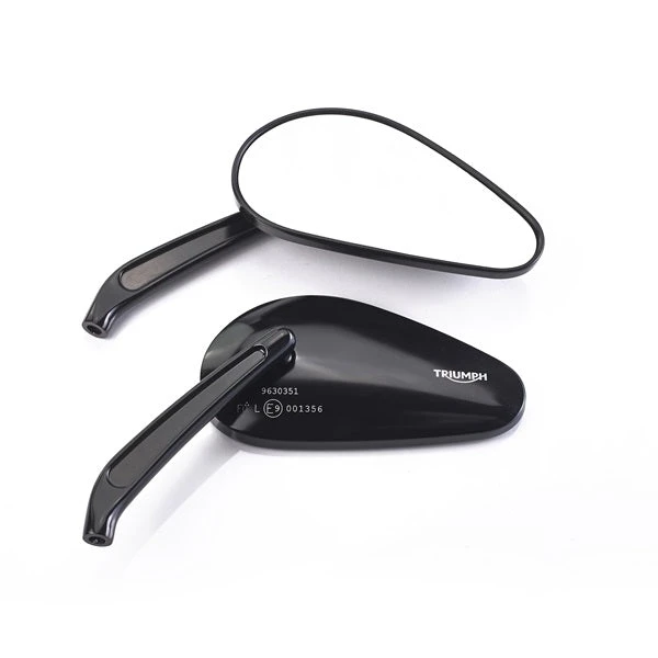 A pair of stylish, anodised black Teardrop Cast Mirrors designed to replace the original equipment item. Featuring laser-etched Triumph branding. Also available with a chrome finish and with an oval-shaped mirror head.
