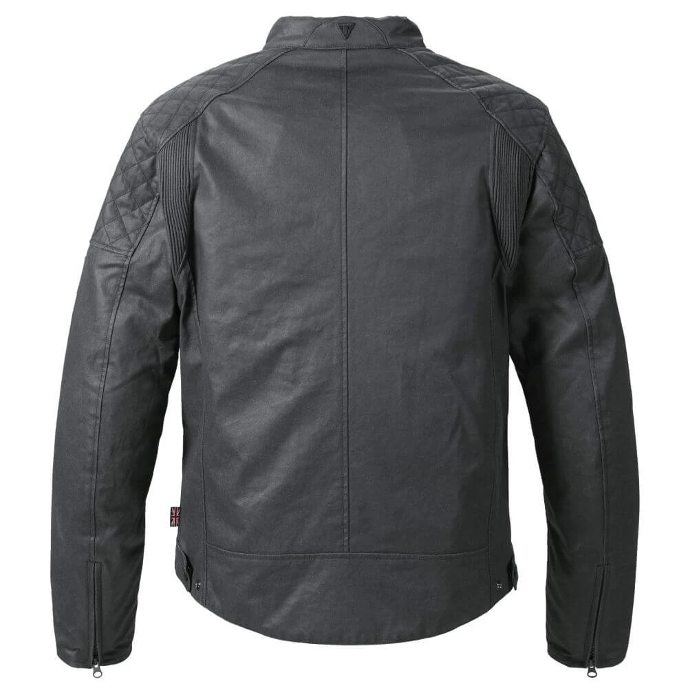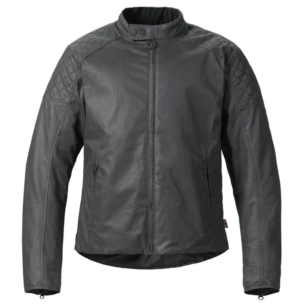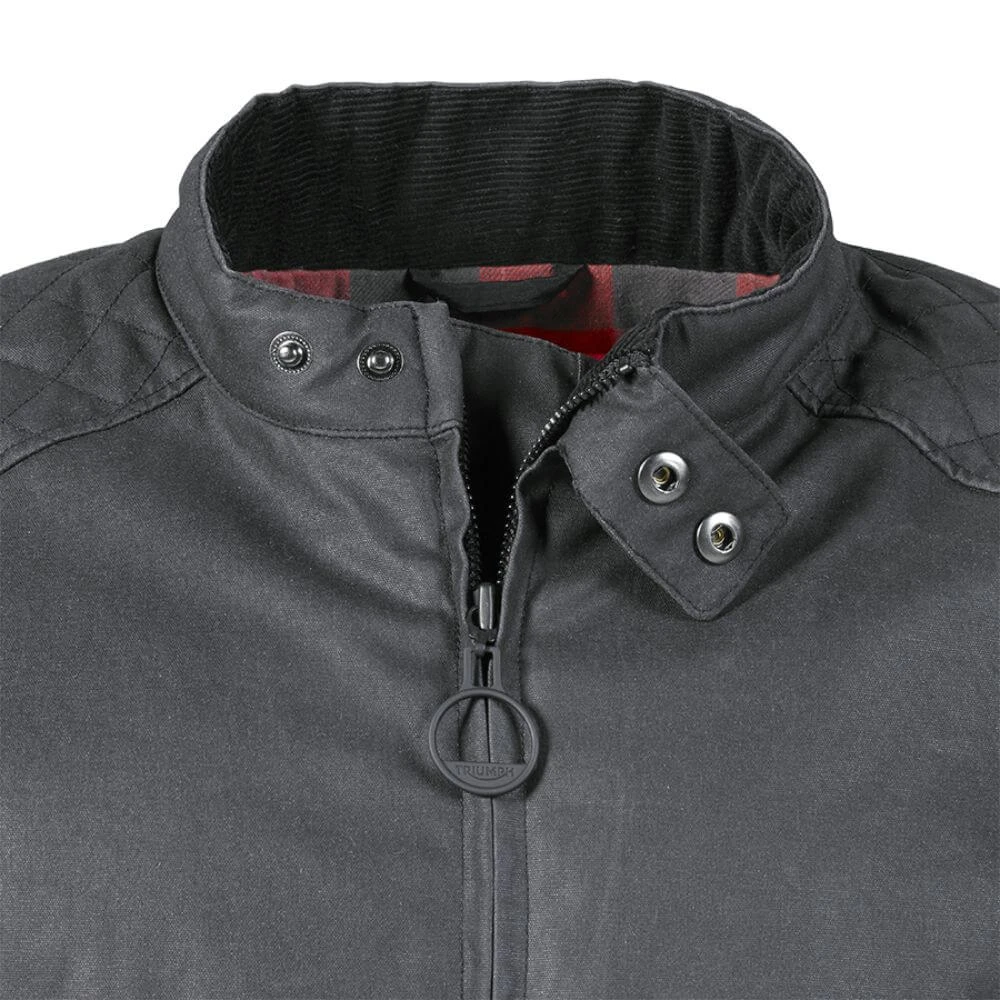 This Triumph Braddan Wax Jacket is an iconic racer-style biker jacket composed of waxed cotton, showcasing quilted stitching on the shoulders and a waterproof z-liner.