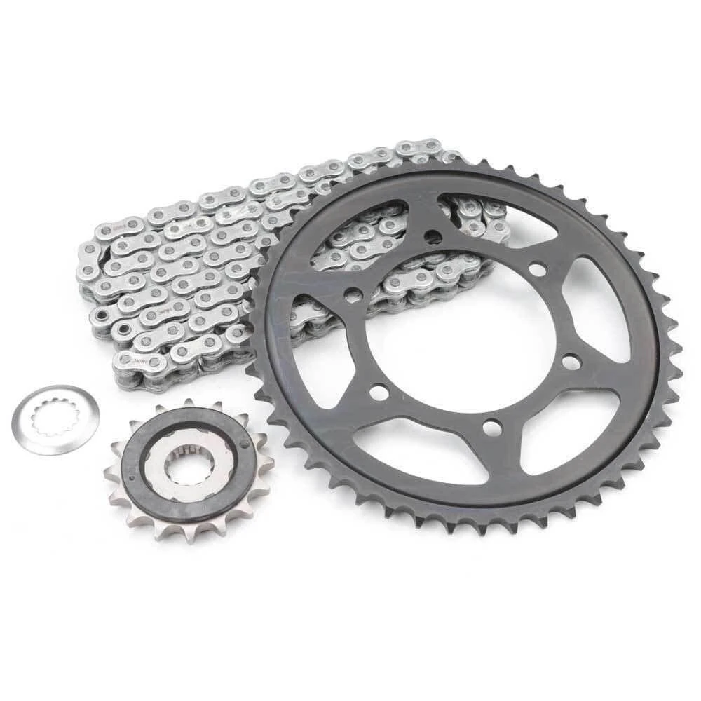 The chain and sprocket kit includes a 117-link chain, a 47-tooth rear sprocket, and a 16-tooth front sprocket. (Spacer washers included if applicable.) This item fits the Street Triple and Street Triple R models up to VIN 560476