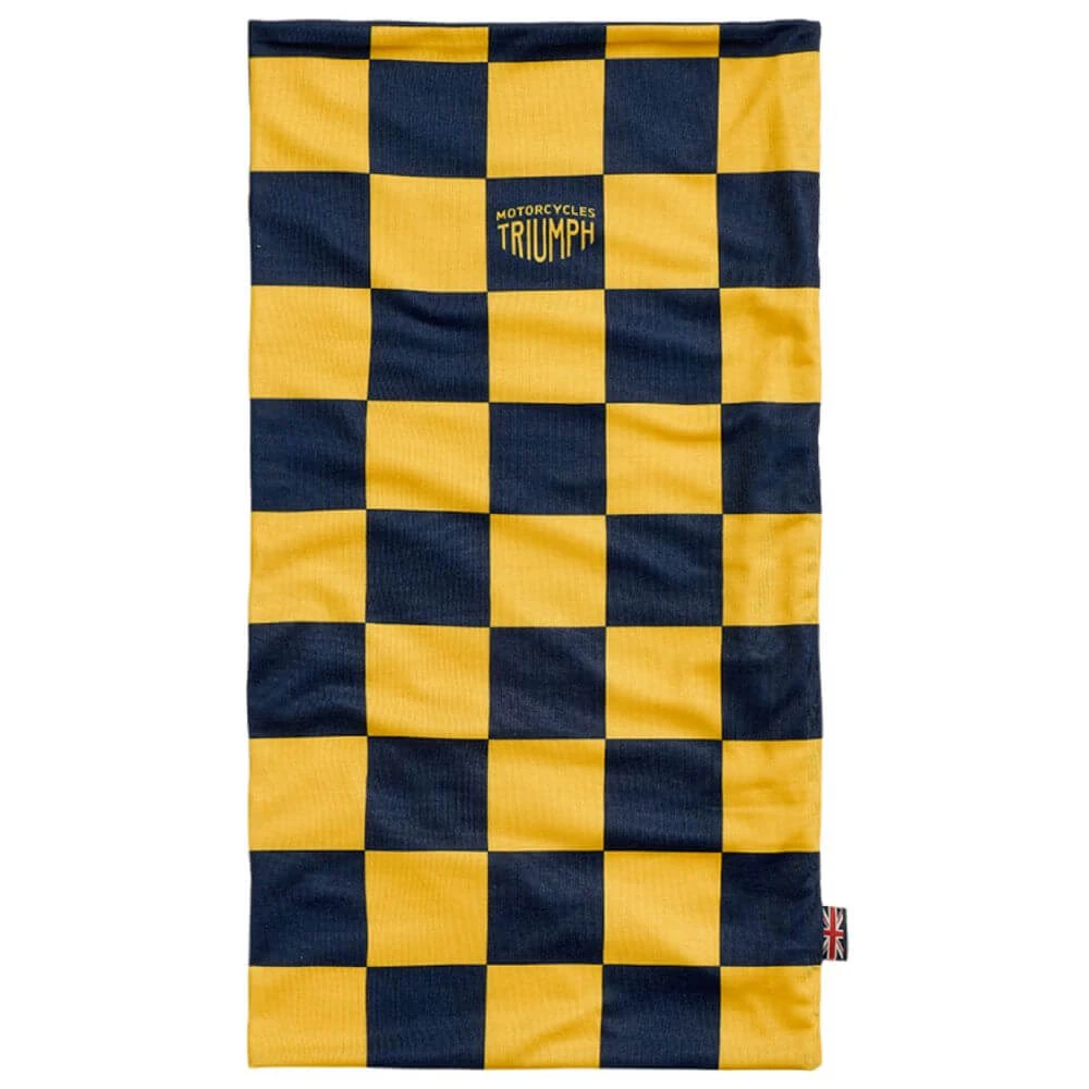 The Triumph Cohen Neck Tube features a premium Navy & Yellow grid pattern, with Triumph Motorcycles detailing.