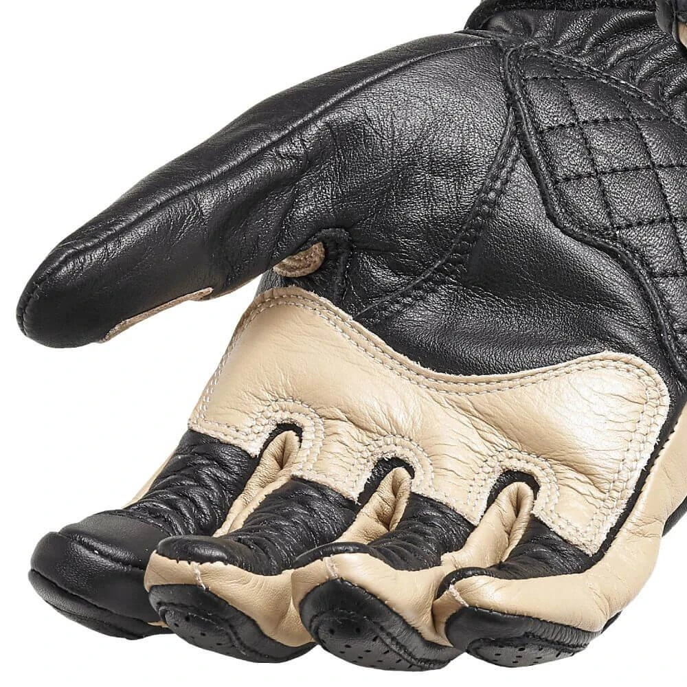 The Triumph Flag motorcycle gloves are constructed from Black and Cream leather with stretch panelling, lightly padded finger details and full-colour Union Jack appliqué. Index fingers include conductive technology for use with touchscreen devices.
