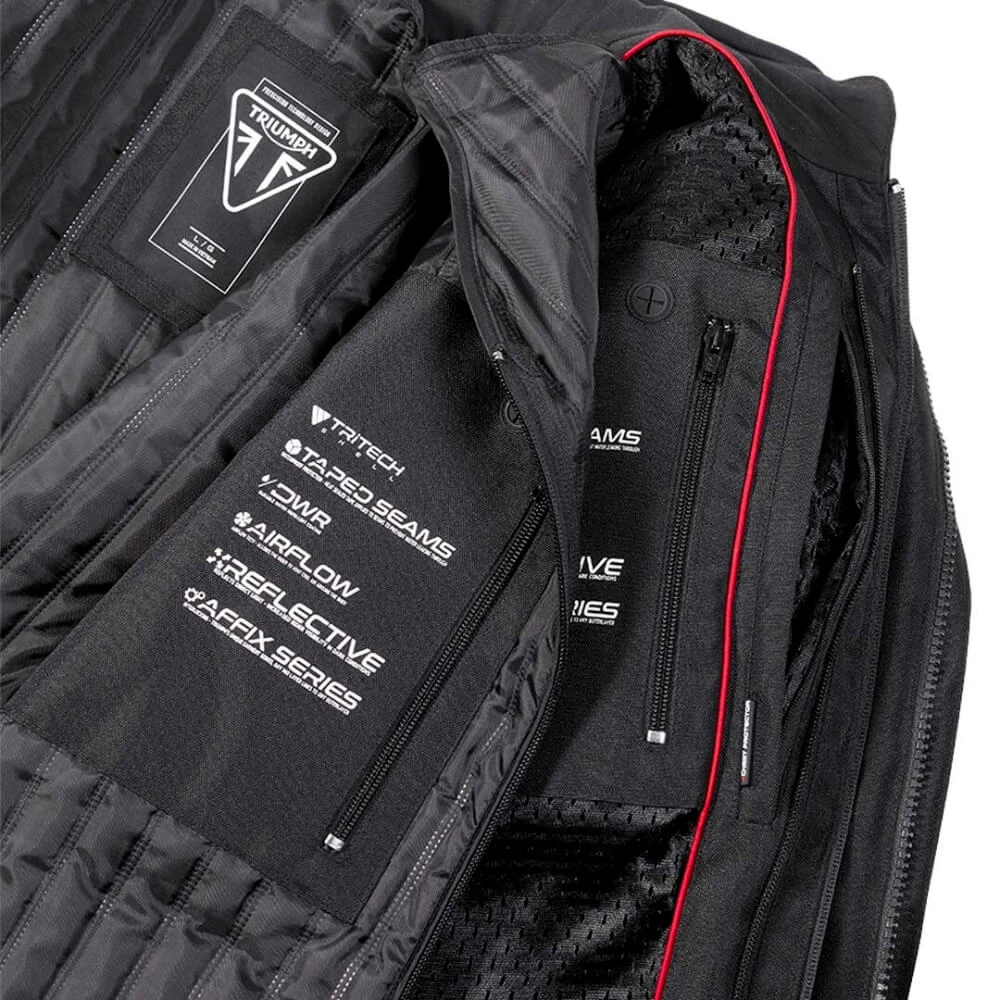 The Triumph Leith Jacket provides superb comfort and convenience for commuting, touring, or tackling off-road trails. The jacket features a highly-functional 3-layer TriTech shell fabric with a superior waterproof and breathable rating, as well as a detachable insulated liner which can be adjusted to suit any weather situation. Additionally, the jacket is outfitted with resilient removable D3O shoulder, elbow, and back protectors, granting optimal protection.