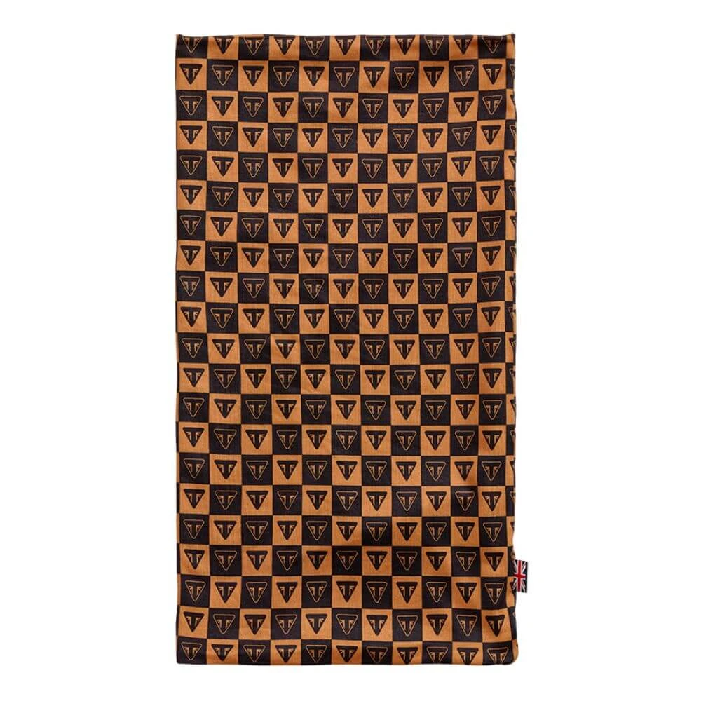 The Triumph Prix Neck Tube boasts a premium Black & Dull Gold checked pattern, accentuated with repeating Triumph triangle badge details.