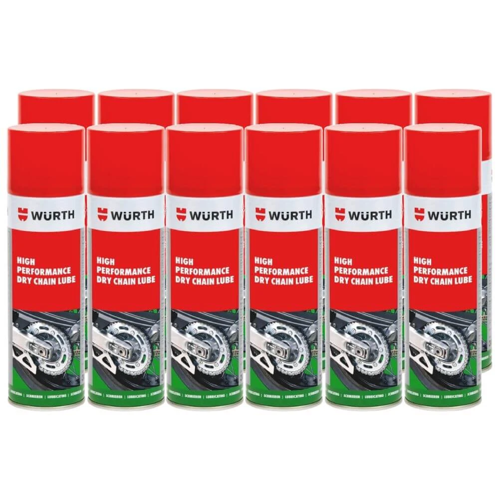 The Wurth High Performance Dry Chain Lube (500ml) lubricates and protects motorcycle and other chains with its tough-elastic lubricating film. Highly adhesive and pressure-resistant, it prevents running noise and wear while protecting against corrosion. It is also water, steam, and acid/base-resistant and – uniquely – can be applied to running machinery with the user’s hands outside the danger zone.